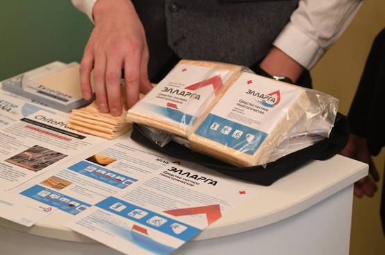 该项目的主管Sergei Brusov是这样解释这种绷带的工作原理的:纳米粒吸收血液中的水,帮助血液更快凝结;通过大幅提高凝结的血块中血纤蛋白原和其它蛋白质的含量,纳米粒可以加速伤口的自然愈合。此外,壳聚糖颗粒会紧紧地附着在人体组织上,这让更多的血块得以形成,帮助伤者在赶到医院之前就成功止血。