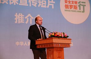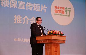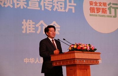 2月21日,中国驻俄罗斯使馆举办《安全文明俄罗斯行》领保宣传片推介会。俄外交部、联邦旅游署、“旅游无国界”组织和中国国家旅游局、航空公司、中资公司、华侨华人社团及留学生代表共130余人出席。李辉大使、俄外交部无任所大使陶米恒、俄联邦旅游署副署长科罗廖夫及中国国家旅游局、南航驻俄代表先后致辞。