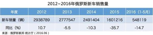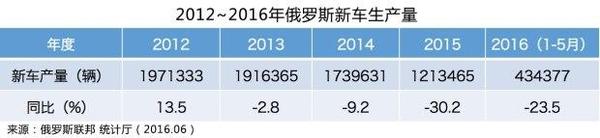 与宏观经济下行同步的是汽车产量的下降,从2012年开始,俄罗斯汽车生产量逐年下跌。2015年是一个低点,生产量为121万3465辆,同步下降30.2%。俄罗斯汽车进口量也同比下跌,2014年进口汽车70万3300辆,2015年进口34万9900辆,2016年到4月份进口7万9400辆。2015年俄罗斯汽车生产,与零部件生产相关企业大部分经营困难。