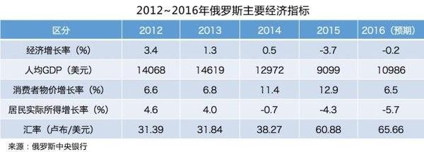 首先看一下俄罗斯的经济形势。2012年,俄罗斯的GDP还增长了3.4%。但是从2013年开始,俄罗斯的经济就开始走下坡路了,2015年首次出现负增长。卢布兑美元从2012年的1美元兑31.39卢布,变成如今的1美元兑65.66卢布,卢布大幅度贬值。
