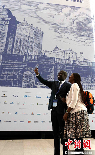6月16日,两名与会者在大幅圣彼得堡国际经济论坛海报前留影。中新社记者 王修君 摄