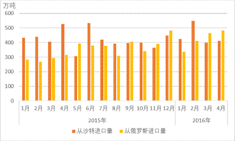 2016年4月,中国从俄罗斯进口原油量达480.6万吨,同比增长52.4%,与去年12月的历史最高水平基本持平,同时俄罗斯则是继今年3月后再度超越沙特成为中国最大的原油进口来源国,也是历史上首次连续两月超越沙特。