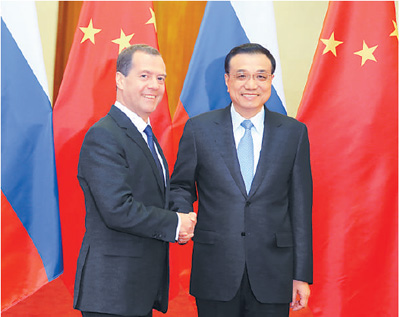 李克强表示,在国际政治、经济、金融环境复杂多变,大宗商品价格低迷,各主要经济体下行压力加大的背景下,中方愿同俄方共同努力,发挥相互投资的引擎作用,把产能和装备制造合作作为新的增长点,落实好重点合作项目,促进双向投资便利化,提高投资活力,深化能源资源、财政金融、航空航天、农业、军技等领域合作,为中俄务实合作提质增量。开展石油勘探、开发、炼化上中下游一体化合作。对接中方创新驱动发展,大众创业、万众创新,“中国制造2025”和俄方“创新2020战略”,大力发展高科技和创新合作,早日启动中俄创新对话,探索建立创新合作新模式。深化中俄人文交流,在成功举办中俄青年友好交流年基础上,筹划和落实好中俄媒体交流年各项活动。