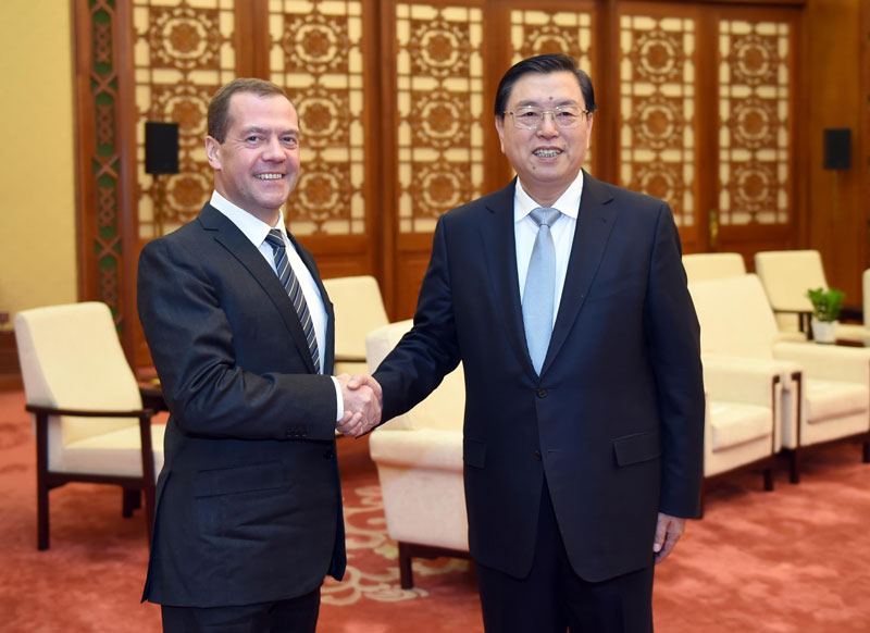 12月16日,全国人大常委会委员长张德江在北京人民大会堂会见俄罗斯总理梅德韦杰夫。