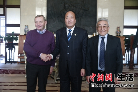 哈萨克斯坦食品研究院院长(右一)、副院长(左一)与李金元董事长合影。