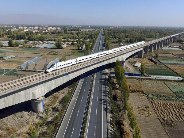 10月18日,动车行驶在位于甘肃省张掖市的兰新高铁与连霍高速的一处交叉立交上。 新华社记者 范培珅 摄