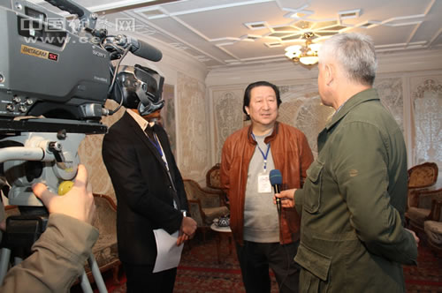 中国国家画院院长杨晓阳接受乌电视台采访。中国经济网记者 李垂发摄