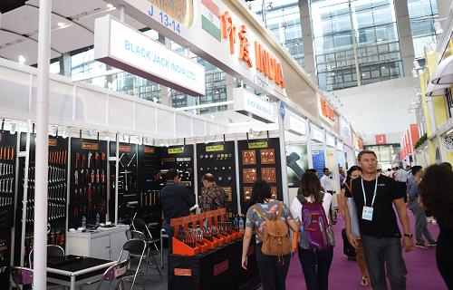 10月16日,客商在广交会印度企业展位上参观选购。新华社记者 卢汉欣 摄 |