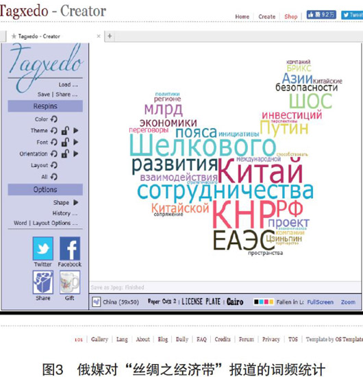 本文使用词云软件Tagxedo制作了俄媒对“丝绸之路经济带”报道语料库的词云图,并用“layout Options”功能删除了一些前置词、代词等不需要的词和标签。如图3所示。