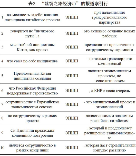 (二)俄媒对“丝绸之路经济带”报道的索引行分析