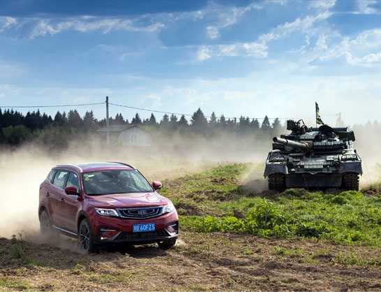 中俄资讯网资料图:吉利博越在莫斯科坦克体验场,与俄罗斯现役坦克展开竞速追逐赛