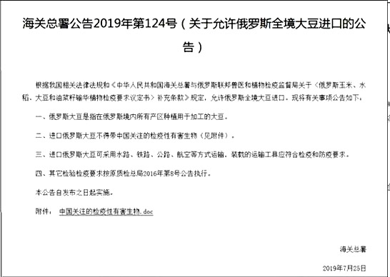 中国海关总署日前在官网发布公告称,根据中国相关法律法规和《中华人民共和国海关总署与俄罗斯联邦兽医和植物检疫监督局关于<俄罗斯玉米、水稻、大豆和油菜籽输华植物检疫要求议定书>补充条款》规定,允许俄罗斯全境大豆进口。