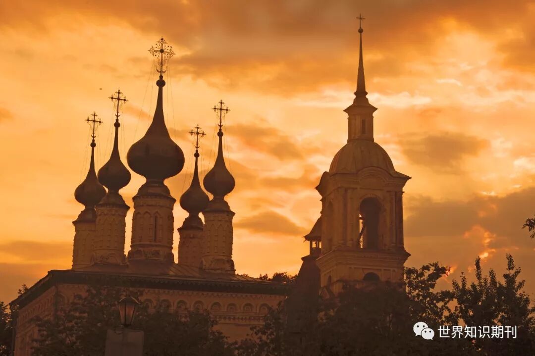 俄罗斯城市苏兹达里,晚霞中的东正教教堂。