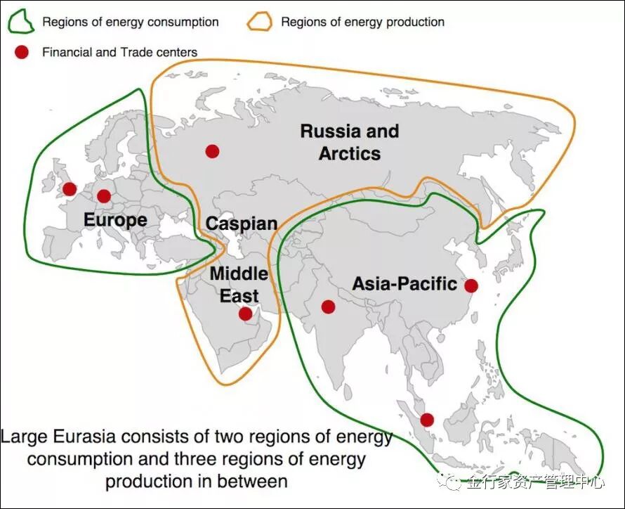 报告所使用的一张地图,将整个亚欧大陆一分为三:中部能源生产区和东西两大能源消费区。俄罗斯和北极、里海和中东地区,组成能源生产区,并将两大能源消费区隔开;西端能源消费区,是包括土耳其和乌克兰在内的欧洲,东端能源消费区是包括印度在内的亚太地区。