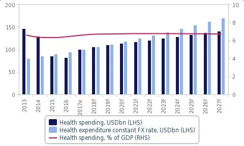 2017年医疗保健支出的GDP占比为6.6%,预计到2027年将上升至6.7%。人均医疗支出在2017年为697美元,到2027年将增至999美元。