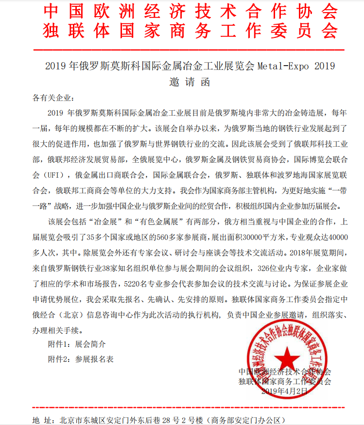 关于邀请参加2019年俄罗斯莫斯科国际金属冶金工业展览会Metal-Expo2019的通知